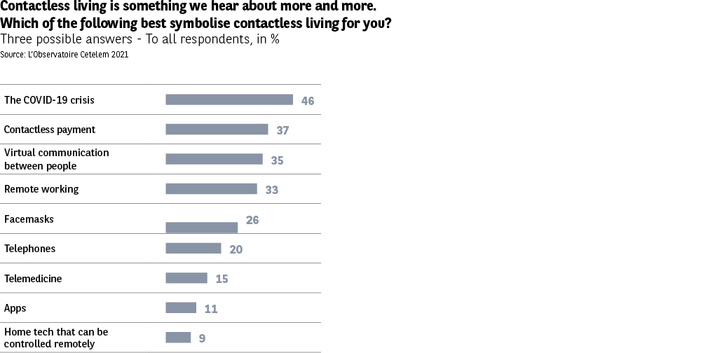 A relatively reasonable distance behind, in second place, is contactless payment, which is cited by 37% of Europeans, with significant differences from one country to the next. The Italians and Portuguese are again of a similar mind, mentioning this example in very few cases (13% and 19%). The Hungarians and British view it as the very epitome of contactless living (62% and 61%).