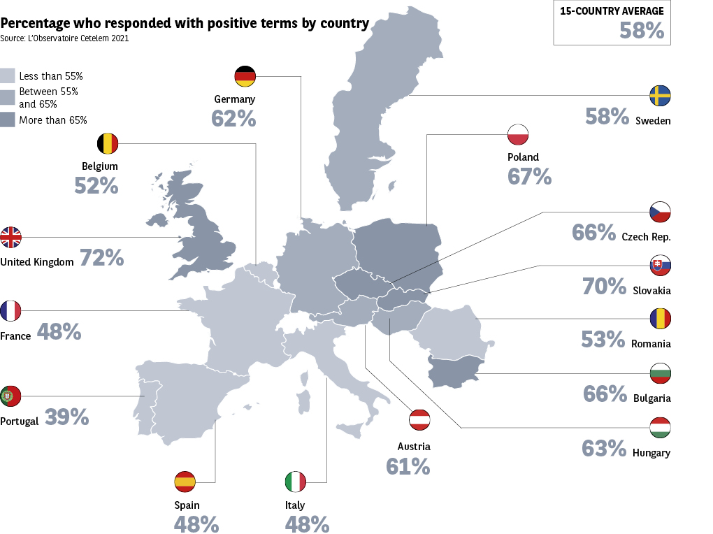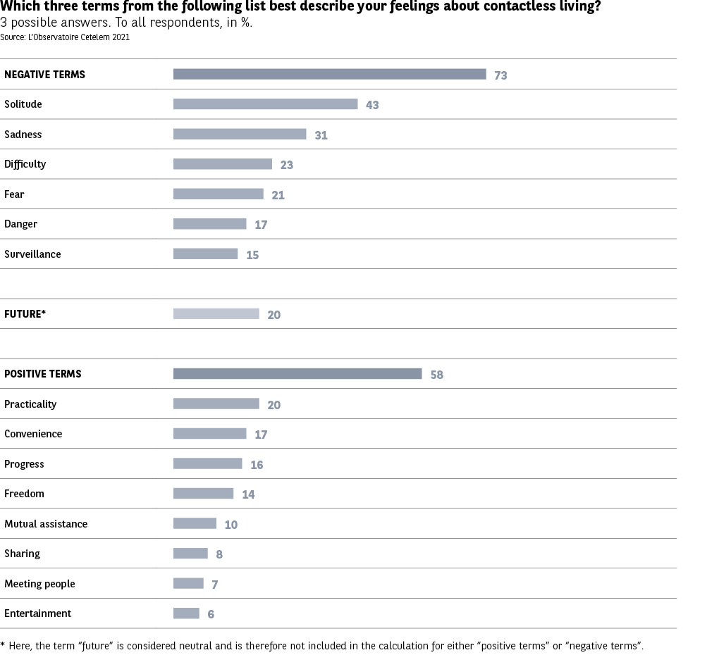 It is followed by three other negative terms that Europeans associate with contactless living: sadness, difficulty and fear (31%, 23% and 21%). The first of these is again most likely to be felt in Portugal and France, but it also ranks high in Spain and Romania. The Italians and Romanians attest to the difficulty involved in contactless living. The Portuguese, Spanish and Hungarians speak of the fear it engenders.
