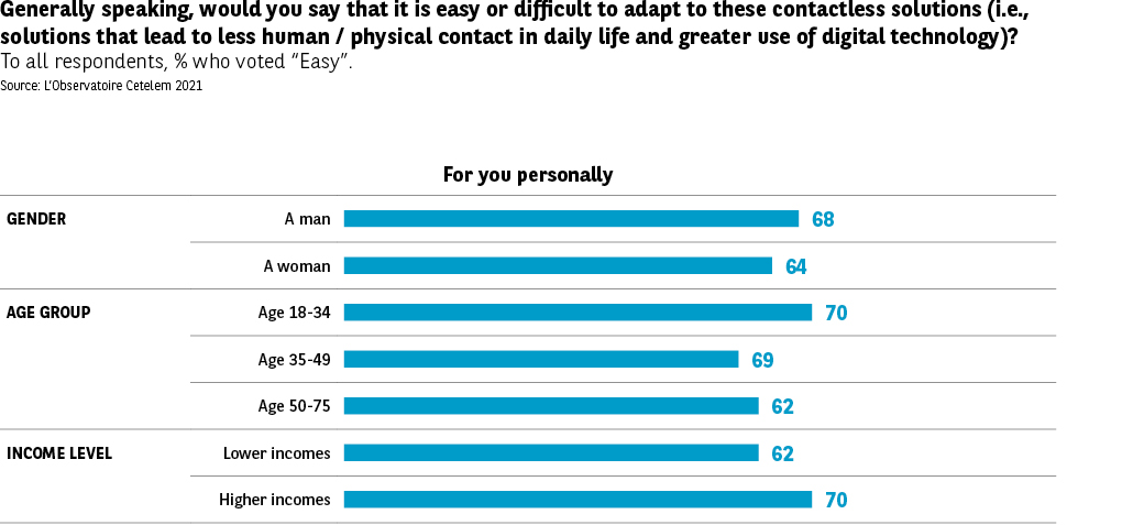 Irrespective of gender, age group or income level, two-thirds of Europeans find it easy to adjust to contactless practices (Fig. 27).