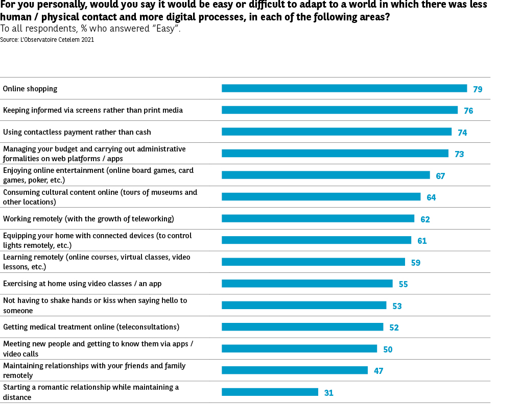 Young people, meanwhile, will find it easiest to take advantage of contactless living. 71% of Europeans are of this view. The “iGeneration”, a term coined by psychologist Jean Twenge, were born with a smartphone in their hand and hold a decisive “genetic” digital advantage. The qualitative interviews conducted for this survey highlight the fact that opinion on this topic is divided regardless of the generation. However, more contrasting opinions can be observed when we compare countries. 82% of Czechs are of this belief, but only 57% of Belgians agree.