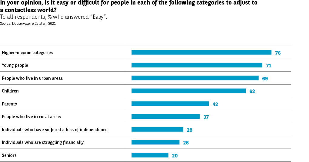 These results point to the existence of a digital divide, a tangible component of which is contactless living, which is only seen as advantageous to young people, urbanites and the wealthy. These are the populations that increasingly characterise European cities today.