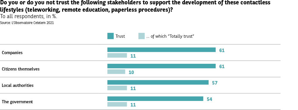 With the exception of several Central European countries, as well as Spain, local authorities are viewed as more likely than not to contribute to the development of contactless practices in a beneficial way. Once again, mistrust is strongest in Central Europe. This feeling even turns to suspicion when it comes to the question of governments’ ability to support this change in a way that is beneficial. Indeed, only 31% of Poles trust their government, a figure that is probably not unrelated to the societal upheaval currently shaking their country.