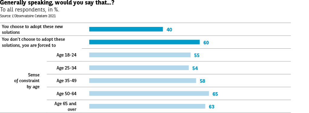 However, the criteria of age and income level reveal varying attitudes on the question of contactless living being a constraint. Young people and higher-income households find it easier to accept these solutions (45% of 18-24 year olds, 46% of 25-34 year olds) than seniors and lower-income households (65% of 50-64 year olds, 63% of those aged 65 and over).