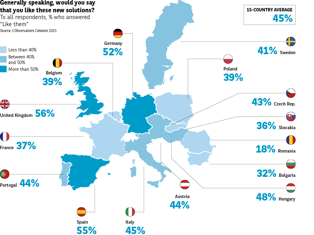 Thus, these new developments tend to be seen as a constraint, but they are also viewed negatively by Europeans on the whole, given that only 45% actually like them. Once again, the United Kingdom and Germany display the greatest fondness for contactless solutions (56% and 52%) (Fig. 21). The Spanish are also more likely than not to display this attitude (55%). The geographical logic we have put forward is generally adhered to. The Romanians and Bulgarians are the least enamoured with these developments (18% and 32%). France’s score is again similar to that of these two countries (37%).