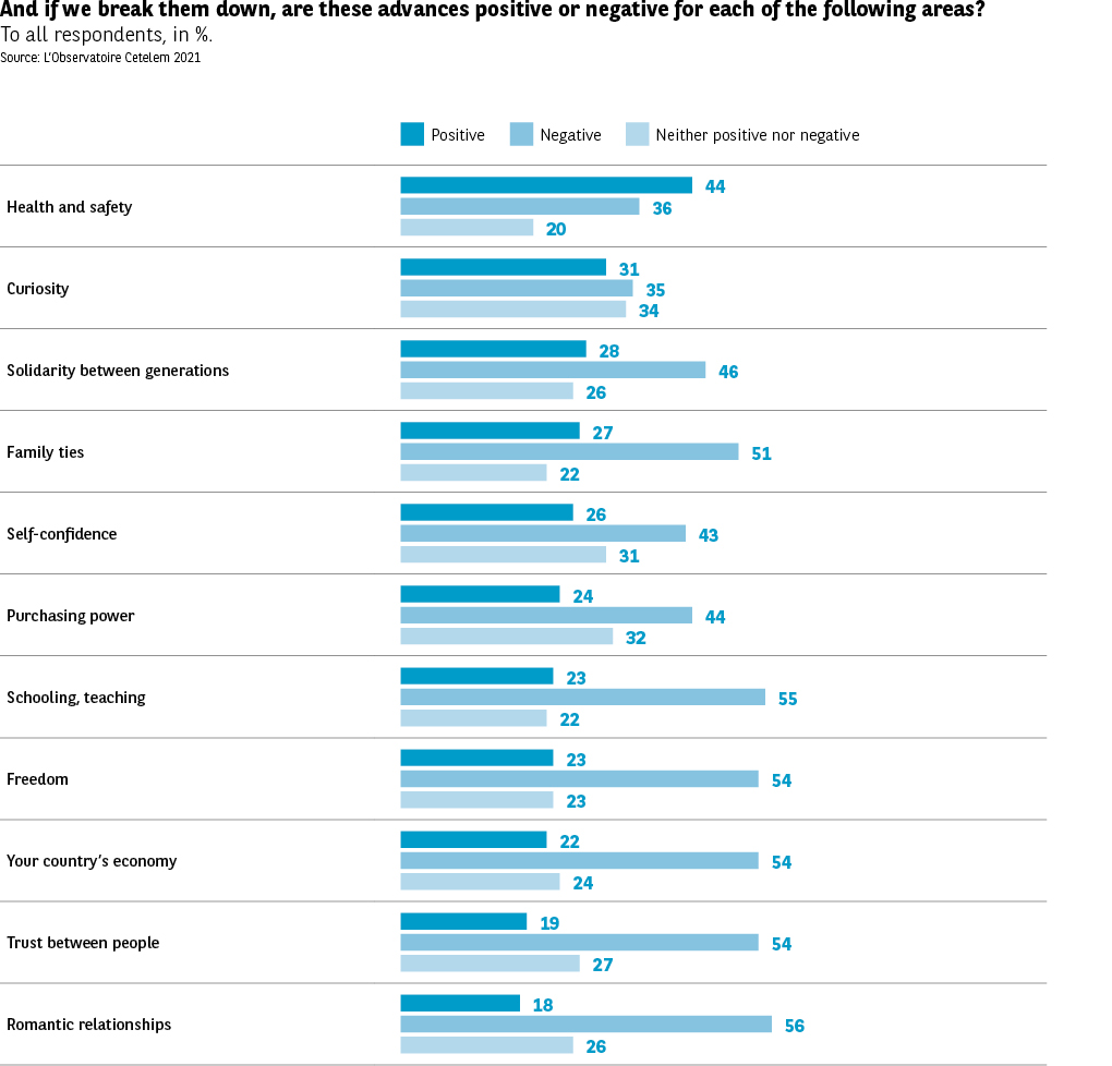 As for every other area examined as part of this survey, negative perceptions outweigh positive ones. And in many cases, more than half of those surveyed express negative feelings, including when it comes to romantic relationships, education, freedom, their country’s economy and trust between people. It should also be noted that, on average, around a quarter of Europeans do not provide an answer when asked about these different areas.