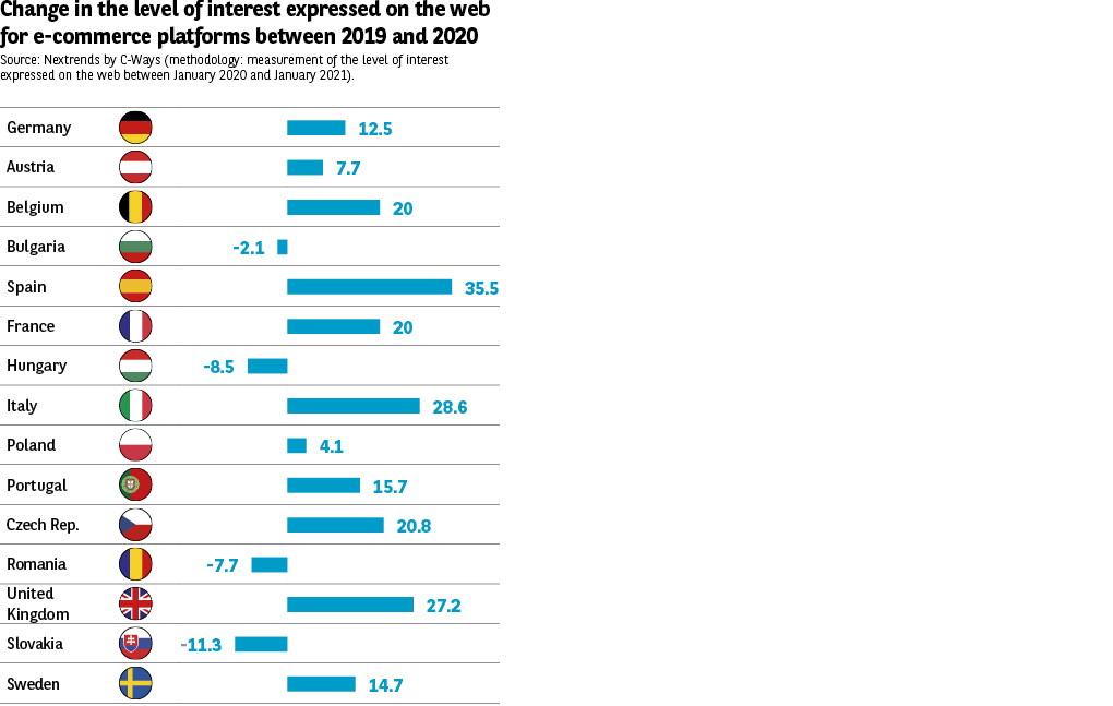 If we look at the detail, the answers of Europeans reveal quite pronounced national traits. For instance, the French are by far the least enthusiastic about shopping online (51% vs. 73%), seemingly confirming their fondness for traditional shops, despite the first lockdown leading to fresh interest in the practice (interest in e-commerce platforms increased by 20% between 2019 and 2020) (Fig. 24). They remain a long way behind the British, who lead the way in this area, and are unable to keep up with the ever growing enthusiasm of the Spanish (whose level of interest has risen 36% this year).