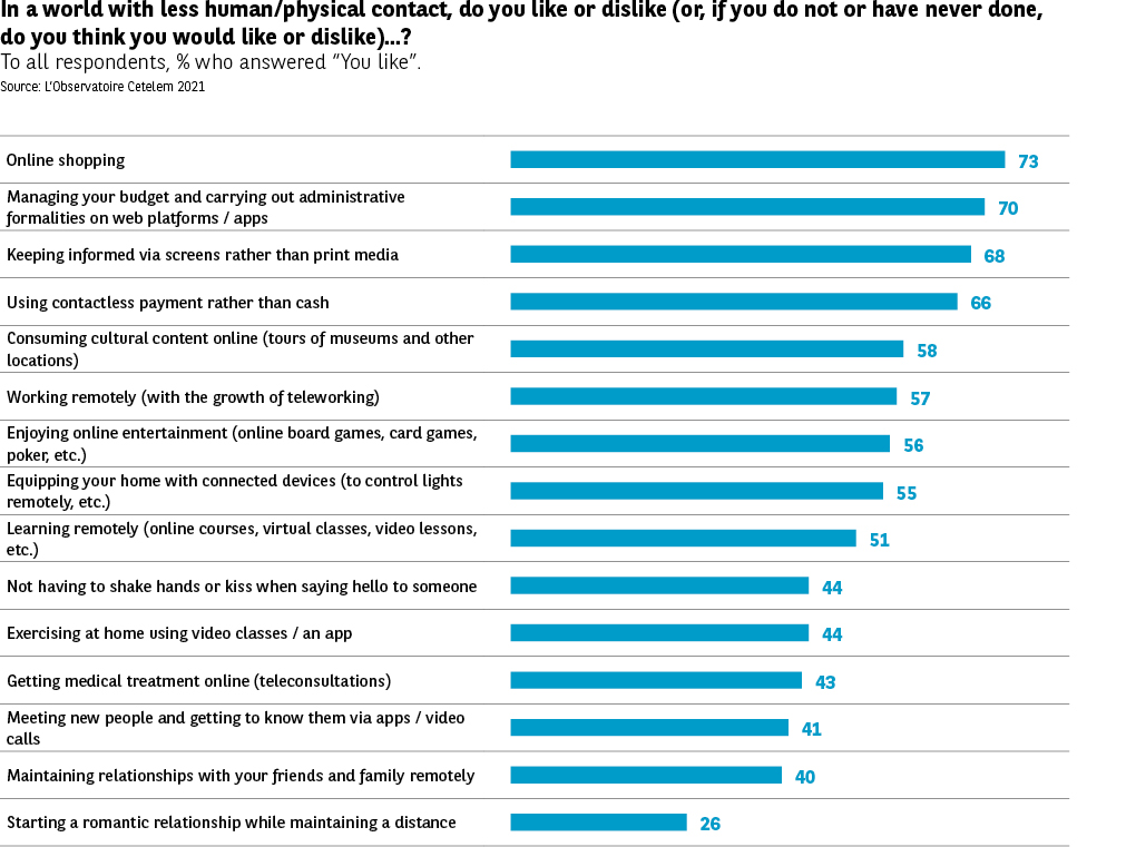 If we’re talking about the former, many people are happy with contactless solutions. When it comes to shopping, managing one’s budget or carrying out administrative formalities online, staying informed via various screens, paying remotely, consuming cultural content virtually, teleworking or playing games on the web, contactless living receives a huge number of “likes” (73%, 70%, 68%, 66%, 58%, 57%, 56%) (Fig. 23).
