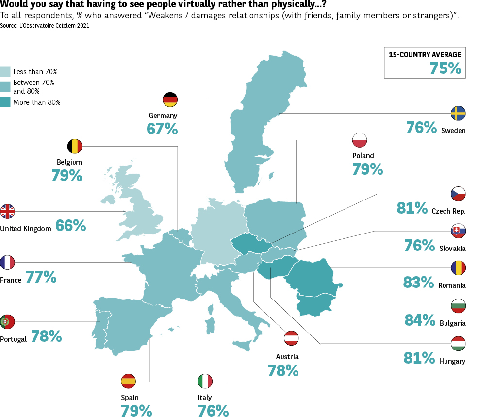 Looking at their testimonies, it is clear that Europeans appreciate the practical side of contactless living, particularly for day-to-day tasks. However, in a more latent way, they express serious reservations regarding the relationship quality it engenders. And when the same Europeans are questioned in greater detail to find out whether life without physical contact weakens or even damages human relationships, the answer is clear and unequivocal. Three-quarters state this to be the case (Fig. 30). Once again, most of the countries in the Northern group, which tend to have greater experience of the virtual world, are more divided on the topic, particularly the British and Germans (66% and 67%). And, as is often the case, we must look to the Central European countries to find opposing views. The Bulgarians, Romanians, Czechs and Hungarians are the most likely to decry the distance that has grown between people (84%, 83%, 81% and 81%). The Latin countries fall between the two, posting scores closer to the European average.