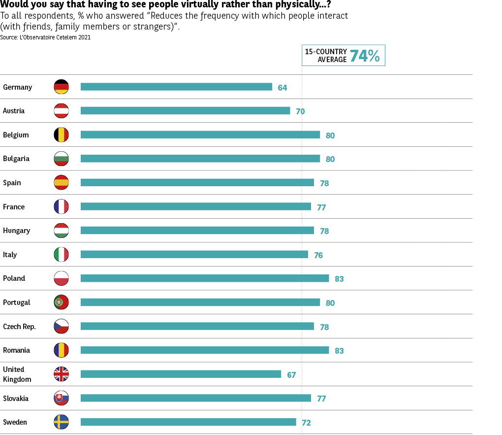 The result could be described as a negative spiral. Not only is the quality of relationships being affected, their quantity is too. Once again, three‑quarters of Europeans believe that contactless living leads to a reduction in the frequency of interaction within relationships (Fig. 31). The differences between the three geographical groups are again very pronounced, with Germany and the United Kingdom in the North appearing less concerned (64% and 67%) and Poland and Romania in Central Europe struggling more with the idea (83%).