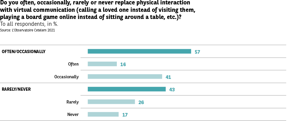The preeminence of the virtual over the real is not something that has happened against the will of Europeans. In fact, it is a deliberate choice for just over half of them. 57% say they tend to replace physical meetings with remote interaction, whether it be to chat or play games online (Fig. 32). On this topic, all countries except Austria and Hungary post scores above 50%. But this time, no geographical groups emerge from the answers given. Thus, the Swedes, Poles and Spanish, whose countries fall into three different groups, are the most likely to opt for virtual solutions (64%).