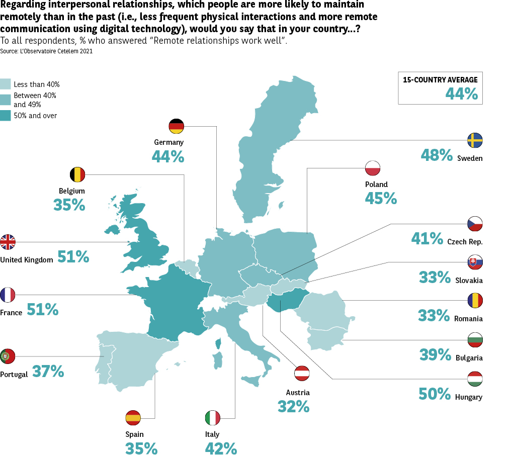 The feeling that a life of contactless relationships is no panacea is widespread among Europeans. Only 44% believe that this type of human relationship works well. The French and British are the most likely to hold this view (51%) (Fig. 33). Generally speaking, contactless interaction is least unpopular in the Northern countries, such as Sweden, while it is perceived more negatively in the South, particularly in Spain and Portugal (35% and 37%). Romania, another country with Latin cultural roots, is even more critical (33%).