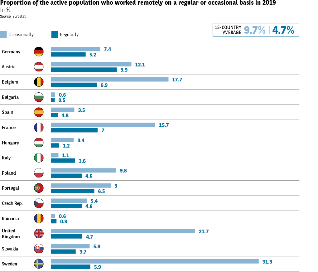 The health crisis has made it clear that working from home has become a potential human resource management lever for companies, not to mention a necessity in the circumstances. Previous years had already seen a marked increase in remote working in many European countries. The United Kingdom is at the forefront of the trend, with 40% of companies adopting teleworking on a permanent basis (source: survey by the Fraunhofer Institute, July 2020). Conversely, countries like Spain and Italy seem to have become familiar with the practice thanks entirely to the pandemic.