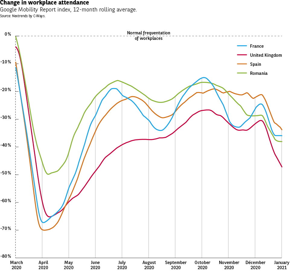 Over the last few months, successive lockdowns have considerably accelerated the trend, probably to the point of irreversibility (Fig. 39). An analysis of commuting data gathered from a panel of European countries shows that people have not returned to the office in the same numbers as prior to the lockdown. As has been said on numerous occasions during the Covid-19 crisis, this is a part of daily life “that will never be the same again”.