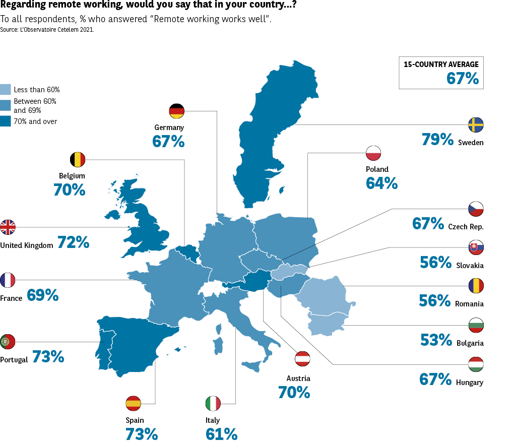The Swedes and the British are very likely to hold positive opinions of remote working. But these are two countries in which it is nothing new. More telling is the fact that Portugal and Spain share their enthusiasm (73%), despite the practice only recently become a reality for workers. In Central Europe, opinions are more measured. Only 53% of Bulgarians believe that teleworking works well.