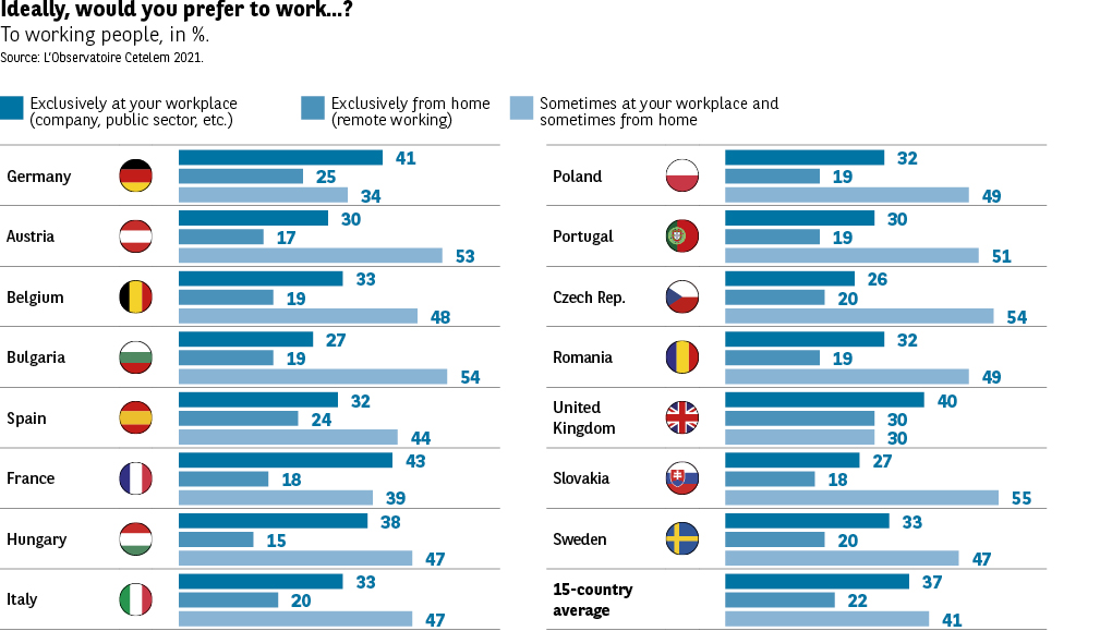 Despite all the points made previously, Europeans are fully aware that work is a form of socialisation. A small minority of working people (22%) want to work exclusively from home, with the British being most likely to hold this view (30%) (Fig. 41). A sign that remote working has become a permanent feature of the world of work, and one that is now ingrained in people’s minds, is the fact that 4 out of 10 Europeans could see themselves alternating between working from home and at their workplace. These individuals just outnumber those who remain more resistant and want to do their job exclusively at their workplace (37%). Preferences vary significantly from one country to the next. While only 30% of Britons are keen to share their time between the two, 55% of Slovaks, 54% of Bulgarians and the same proportion of Czechs would like to do so. The French, meanwhile, are more traditional in their outlook, with 43% keen to work exclusively at their workplace.