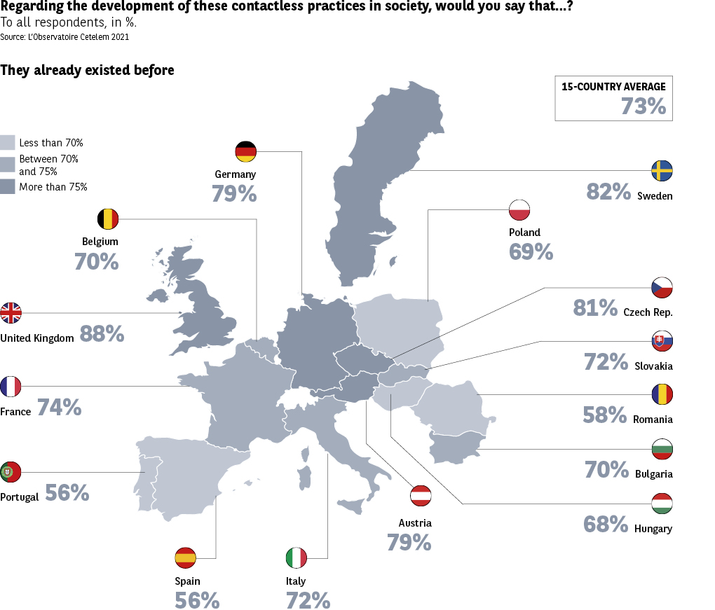 As we will see repeatedly elsewhere in the survey, this pattern can be observed in various situations and opinions. Indeed, this is the case when respondents are asked whether contactless solutions were already in place before the health crisis was upon us. On the whole, Europeans state this to be the case (73%) (Fig. 17). But this view is most commonly held in the Northern group. The British, Swedes and Germans are the most likely to be of this belief (88%, 82% and 79%). The Austrians and Czechs agree with the statement in similar proportions (79% and 81%). Respondents in Southern Europe are far from displaying this level of conviction. The Spanish and Portuguese are identical cases in point (56%). Between the two extremes, the French and Italians post fairly average scores (74% and 72%, respectively).