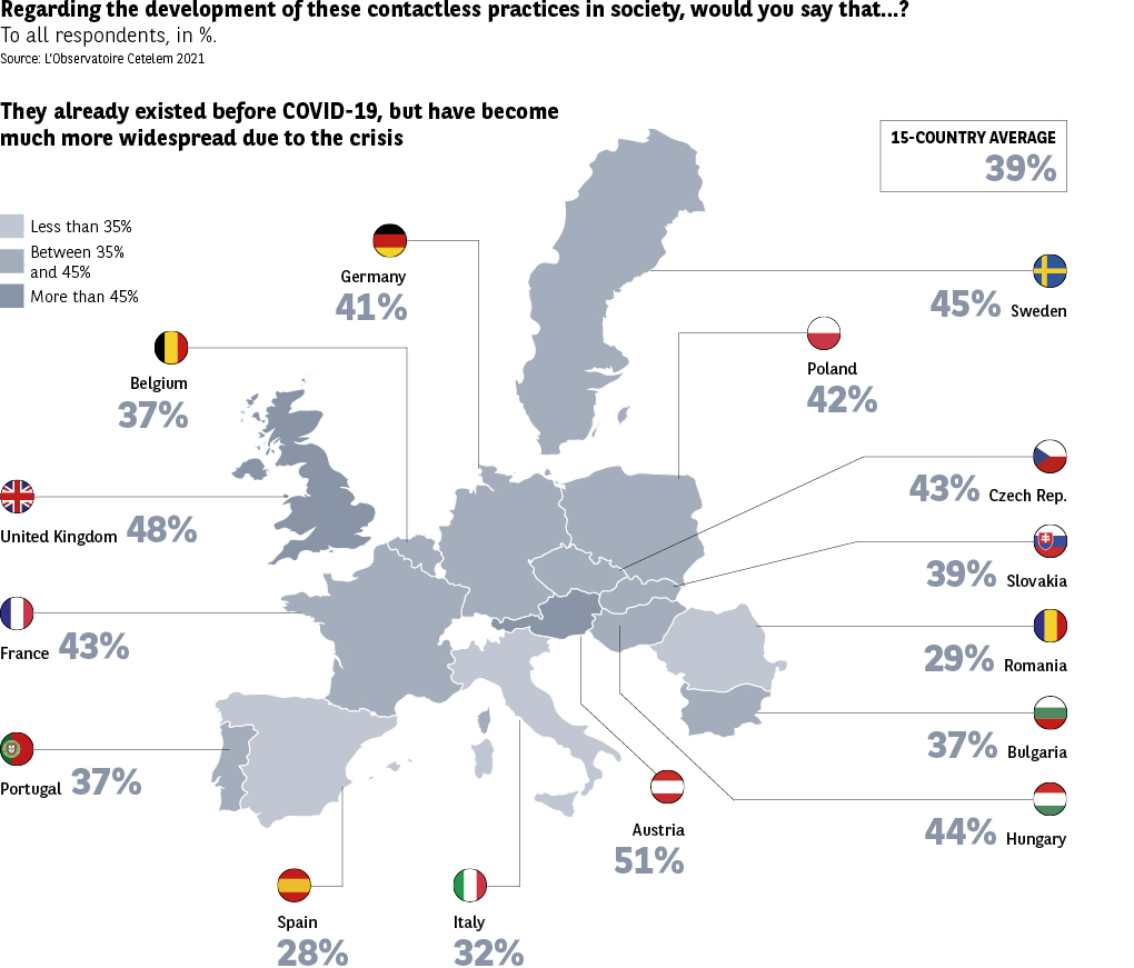 The view that contactless practices already existed is therefore dominant, but Covid-19’s role in expanding their use is just as unequivocal. Close to 4 out of 10 Europeans believe that the crisis has played such a role (Fig. 18). The countries in the Northern group are again fairly united in their opinion, while the Southern countries, as well as Romania, are less convinced of the pandemic’s role as an accelerator of the trend. However, these countries do agree that the health crisis has helped to place a spotlight on contactless practices. This is the case for 44% of Portuguese and Spanish respondents.