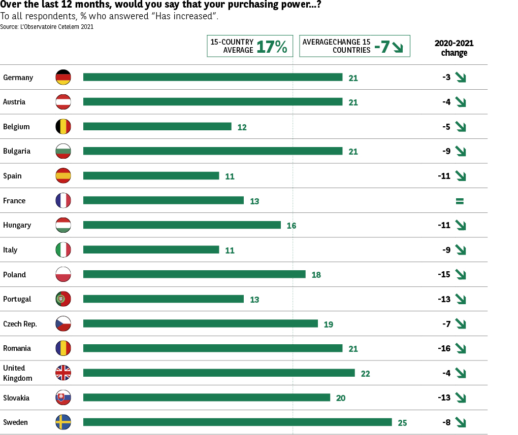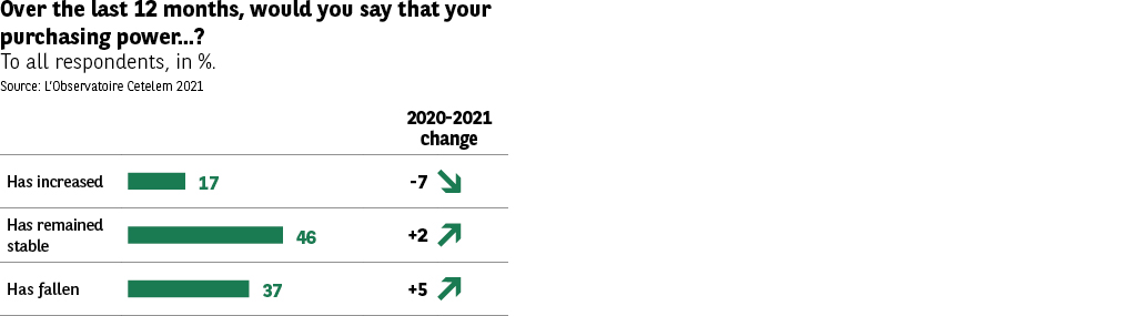 With time feeling as though it has been paused and the economy and social life in general experiencing something of a hiatus, the perception by Europeans that their purchasing power has remained stable is almost identical to last year (Fig. 8 Barometer). Almost 1 in 2 Europeans are of this view (+2 pts). Government support and a drop in consumption go a long way to explaining this result. And yet, it would be reductive to focus solely on this piece of data. 37% of Europeans believe that their purchasing power has fallen, 5 points more than the 2020 figure.