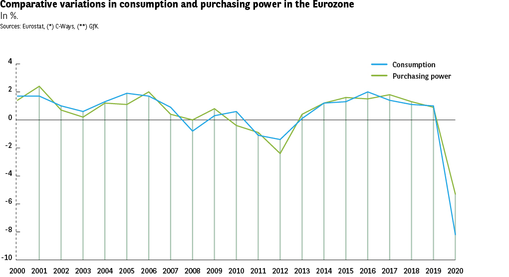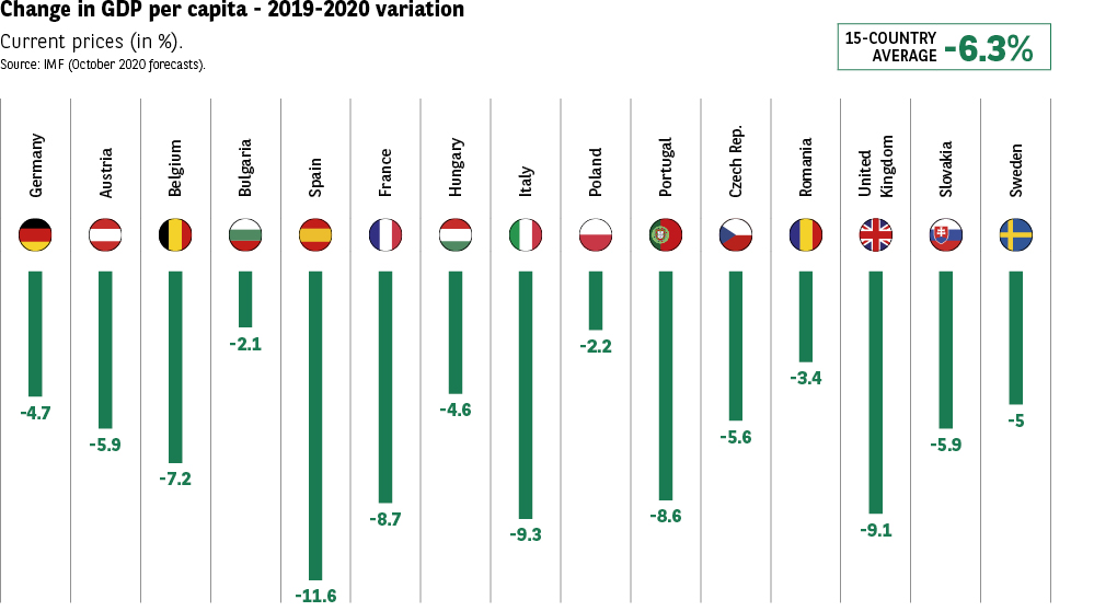 It is no surprise to see economic growth fall in all the countries covered by L’Observatoire Cetelem de la Consommation (Fig. 10 Barometer), with many posting results not seen since the Second World War, and even further back in history in some cases. This decline tends to be more pronounced in the countries most severely affected by Covid-19. The dramatic nature of these figures offers a stark indication of the impact the crisis has had on consumption.