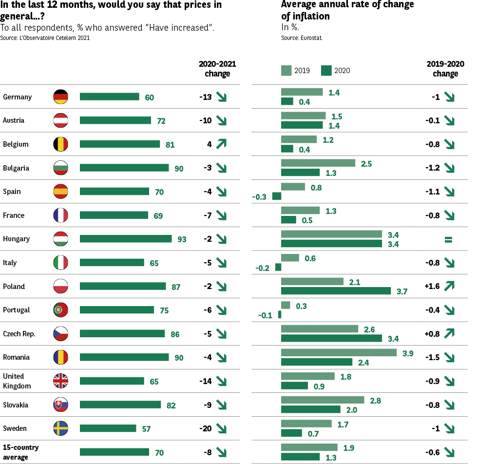It is even more interesting to note that the impression that prices have increased has lost ground consistently in almost all countries over the last three years (Fig. 12 Barometer). In 2019, 8 out of 10 Europeans were of this belief. An examination of actual inflation figures backs up the feelings of Europeans. In most of the countries included in the Observatoire Cetelem Barometer, inflation fell between 2019 and 2020, with negative inflation posted by the three Southern nations: Italy, Spain and Portugal.