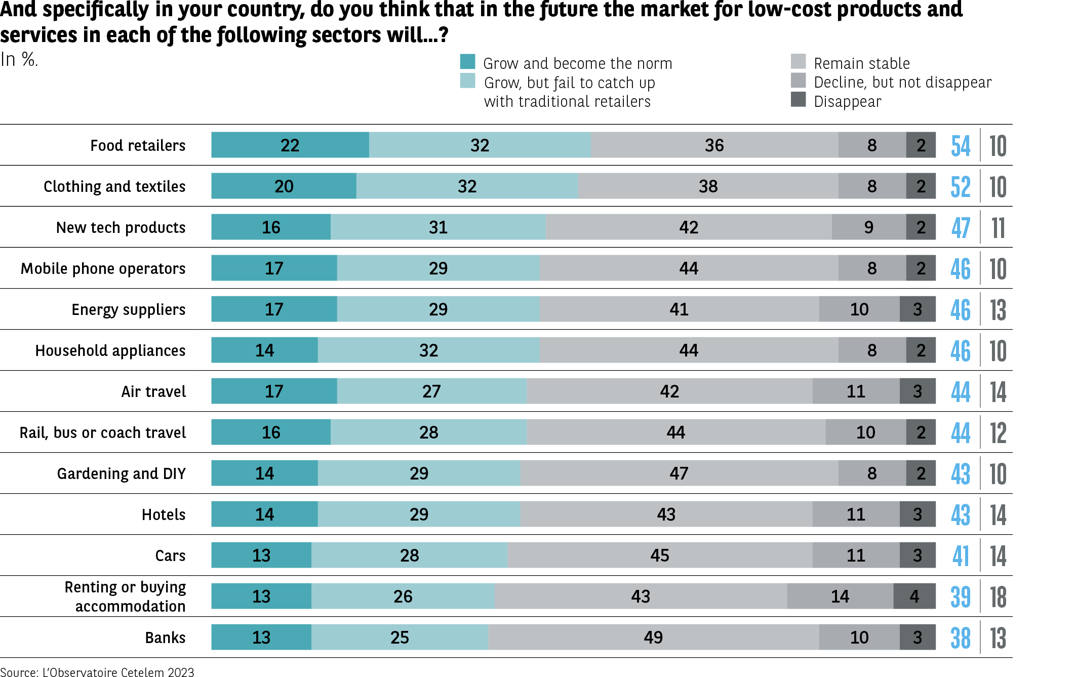 Compares the expected evolution of the low-cost market in various sectors Infographic presenting the opinion of consumers, in %, on the future evolution of the low-cost product and service market in different sectors of activity. Legend (response categories): Will develop and become the norm Will develop but remain less important Will remain stable Will decline but not disappear Will disappear Each line corresponds to a sector with the associated percentages. Data by sector (in %): Food retailers: 22 / 32 / 36 / 8 / 2 Clothing, textiles: 20 / 32 / 38 / 8 / 2 New technology products: 16 / 31 / 42 / 9 / 2 Mobile phone operators: 17 / 29 / 44 / 8 / 2 Energy providers: 17 / 29 / 41 / 10 / 3 Appliances: 14 / 32 / 44 / 8 / 2 Air transportation: 17 / 27 / 42 / 11 / 3 Rail, bus, car transportation: 16 / 28 / 44 / 10 / 2 Gardening and DIY: 14 / 29 / 47 / 8 / 2 Hotels: 14 / 29 / 43 / 11 / 3 Automobiles: 13 / 28 / 45 / 11 / 3 Housing rental or purchase: 13 / 26 / 43 / 14 / 4 Banks: 13 / 25 / 49 / 10 / 3 Each line is followed by two blue numbers on the right (total positive score and total negative score), here: Total positive scores between 38 and 54 depending on the sector Total negative scores between 10 and 18 In all sectors, a majority believes that the low-cost market will be maintained or progress, but rarely become the norm. Source: Cetelem Observatory 2023.