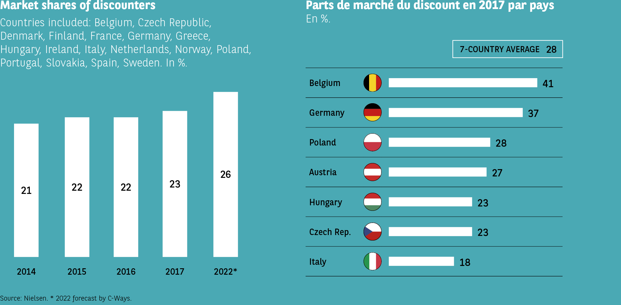 Shows the evolution of the discounter market and the market shares of discount by country in 2017 The infographic includes: The evolution of the market shares of discounters in a set of European countries between 2014 and 2022. The market shares of discount, by country, for the year 2017. The countries in the scope are: Belgium, Czech Republic, Denmark, Finland, France, Germany, Greece, Hungary, Ireland, Italy, Netherlands, Norway, Poland, Portugal, Slovakia, Spain, and Sweden. Evolution of market shares of discounters (2014-2022) Values in %: 2014: 21% 2015: 22% 2016: 22% 2017: 23% 2022: 26%* (*) 2022 is a C-Ways forecast. Market shares of discount in 2017 by country (in %): The average of the 7 countries displayed is 28%. Belgium: 41% Germany: 37% Poland: 28% Austria: 27% Hungary: 23% Czech Republic: 23% Italy: 18% The share of discount has slightly increased over the observed period and remains highly variable by country, ranging from 18% to 41% in 2017. Source: Nielsen. 2022 forecast C-Ways.