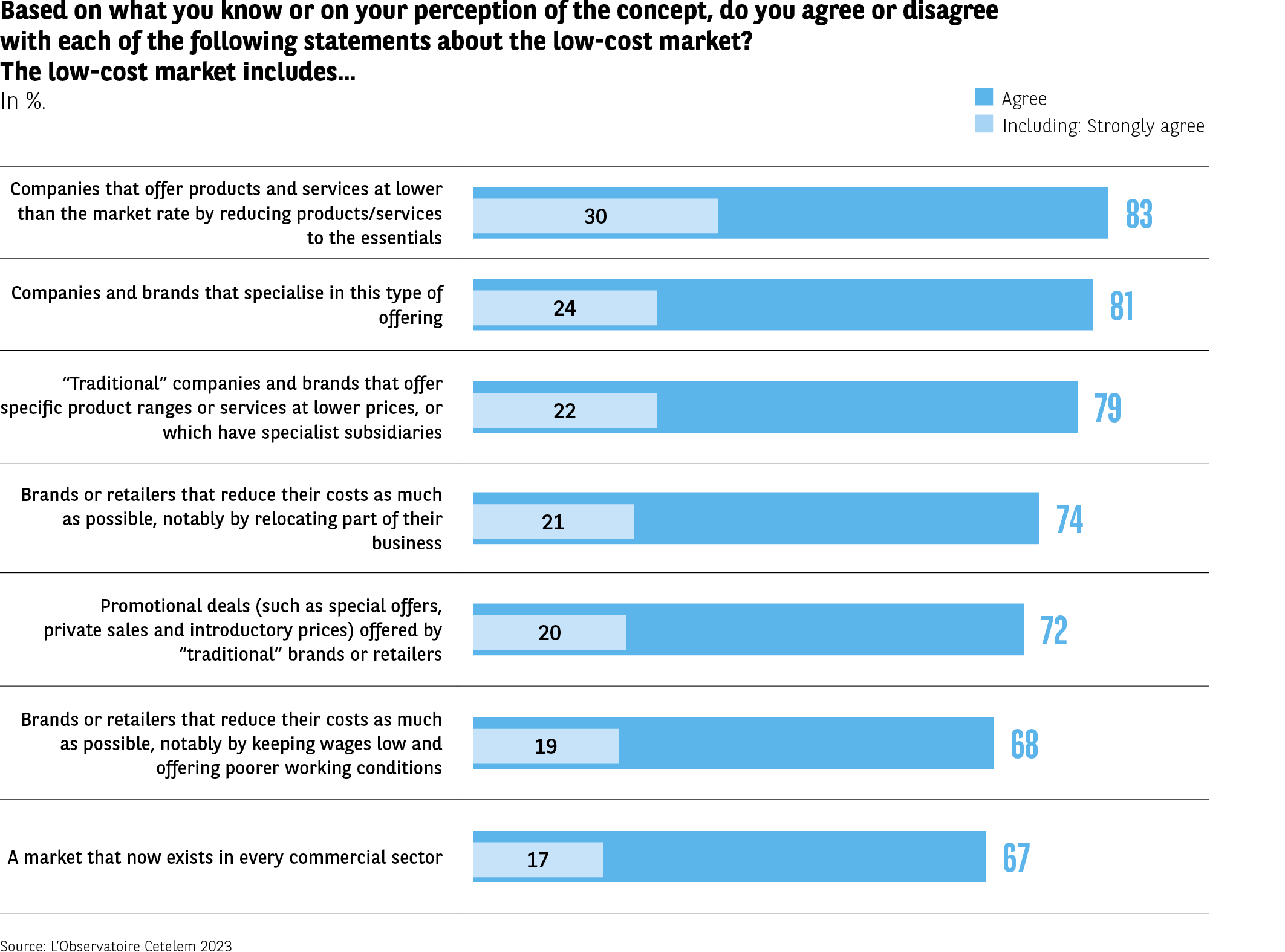 The infographic presents the percentage of respondents who agree with several descriptions of the low-cost market. Each item includes the total percentage of agreement and the percentage of those who are “completely in agreement”.