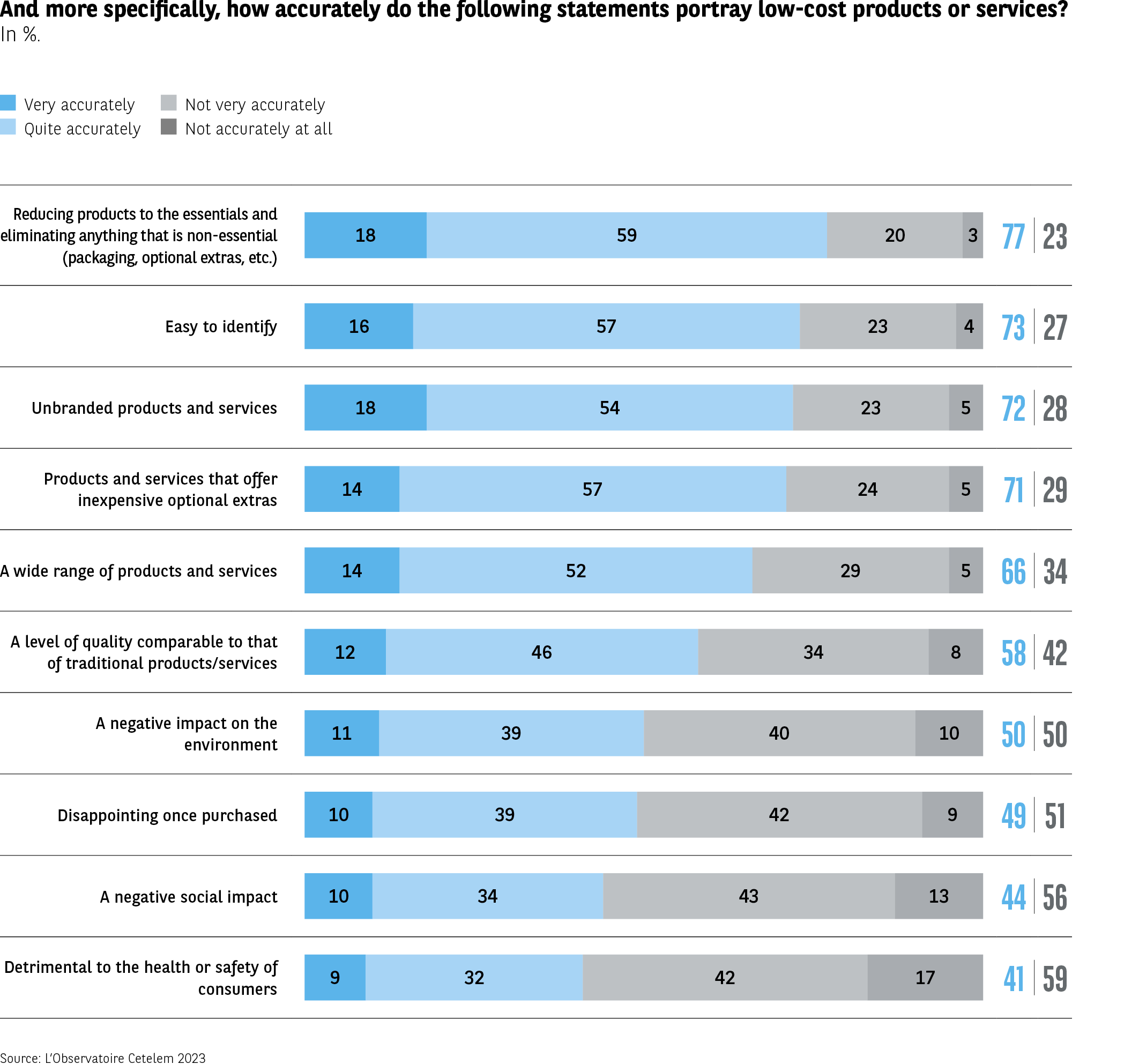 The infographic measures, in percentage, the extent to which ten characteristics “fit well or poorly” with low-cost products or services. Four categories are represented: “Fits very well”, “Fits rather well”, “Fits rather poorly”, “Fits very poorly”.