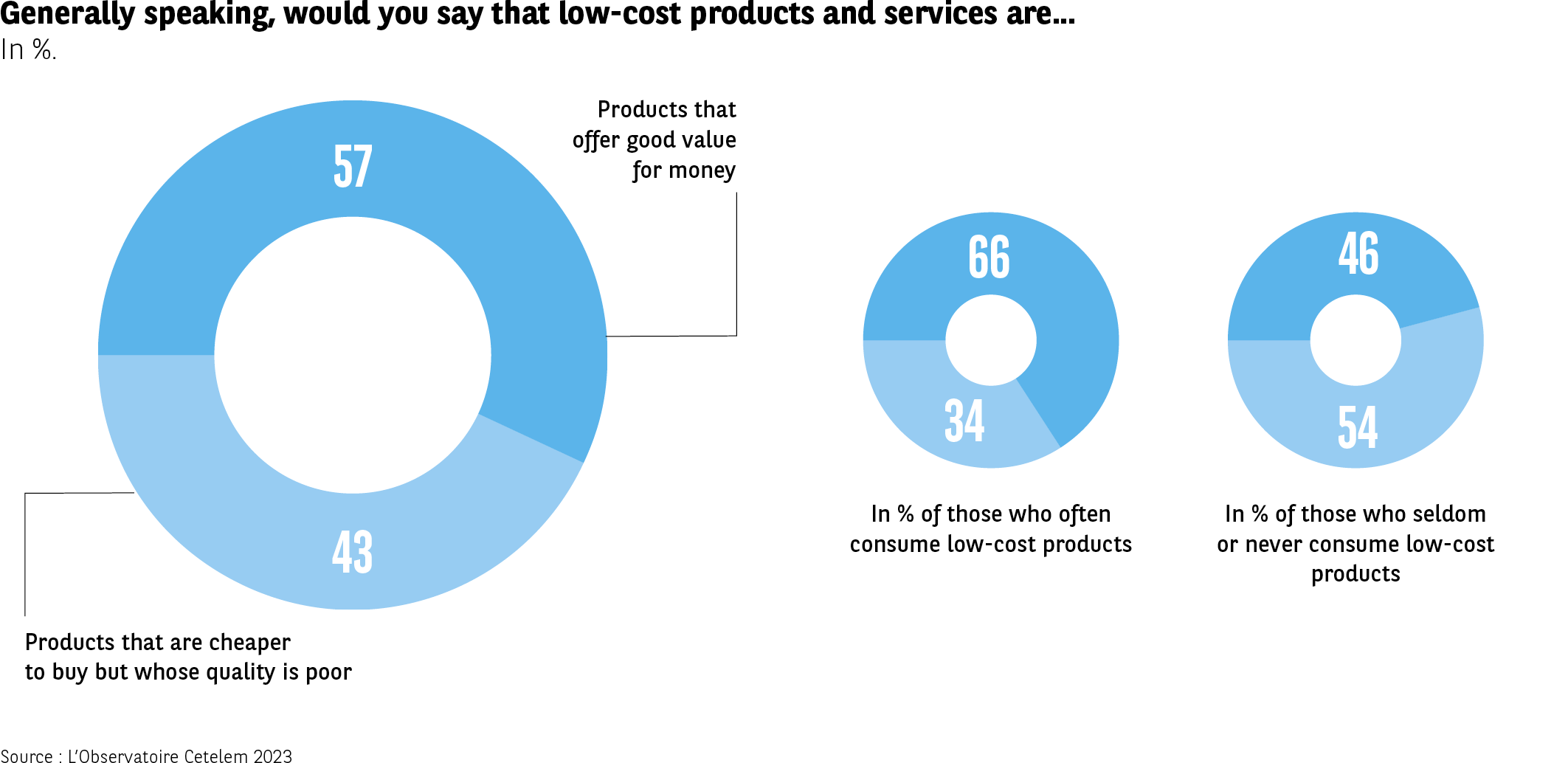 The infographic presents three ring charts. They compare the perception of the quality of low-cost products according to whether respondents consume them frequently or rarely/never.