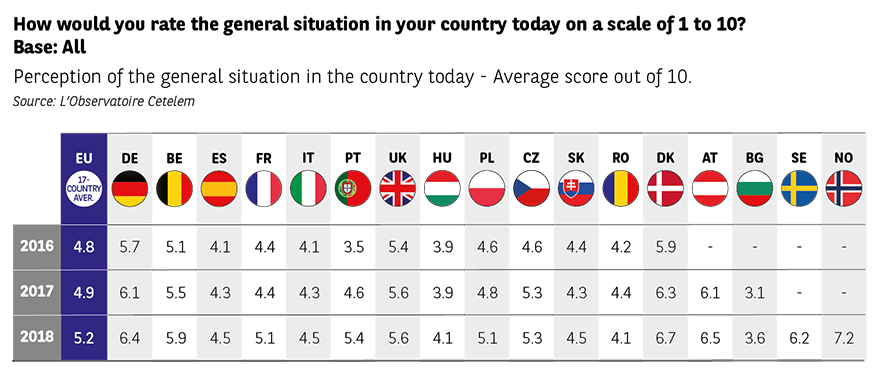 For the first time in many years, the average score Europeans award to the situation in their country is higher than the “pass mark” of 5 (5.3). As a reminder, the score was 4.9 in 2007 and just 3.7 at its low point in 2013. Although there had been a significant positive trend over the course of the last four editions of L’Observatoire Cetelem de la Consommation, this result is particularly encouraging because it reflects the situation in almost every country covered by the survey.