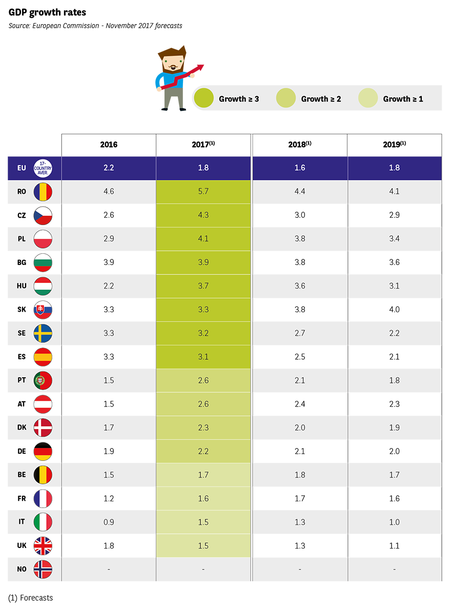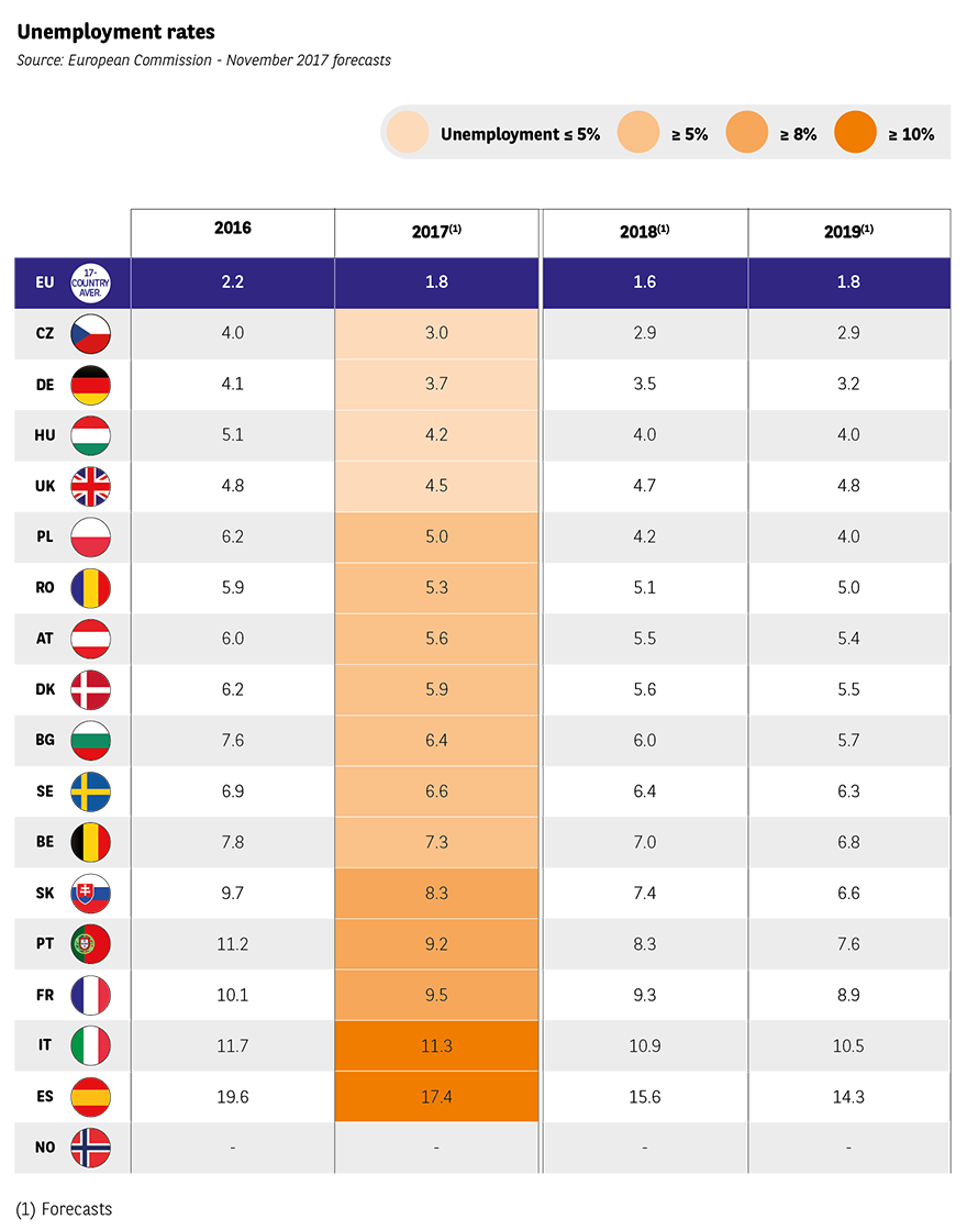 Unemployment is another area in which there is no shortage of reasons to be positive. This particular indicator is down across the board, with results that point to the existence of residual unemployment in some countries, including Germany (3.7%) and the Czech Republic (3%). Nonetheless, unemployment remains high in southern European countries such as Spain, where 17.4% of the active population is jobless, and France, which is struggling to dip under the 10% mark.