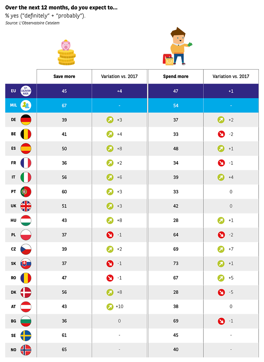 This improvement in personal financial health is also reflected in more positive spending and saving intentions. Both of these L’Observatoire Cetelem de la Consommation indicators have always been borne out in reality. 47% of Europeans (+1 point) intend to spend more over the next 12 months. As in previous years, the desire to consume is stronger in the East (Slovakia: 73%, Bulgaria and Czech Republic: 69%, Romania: 67%). Conversely, the Danes, Portuguese and Belgians display a degree of prudence (28% and 33%), while the French are barely more inclined to spend (34%).