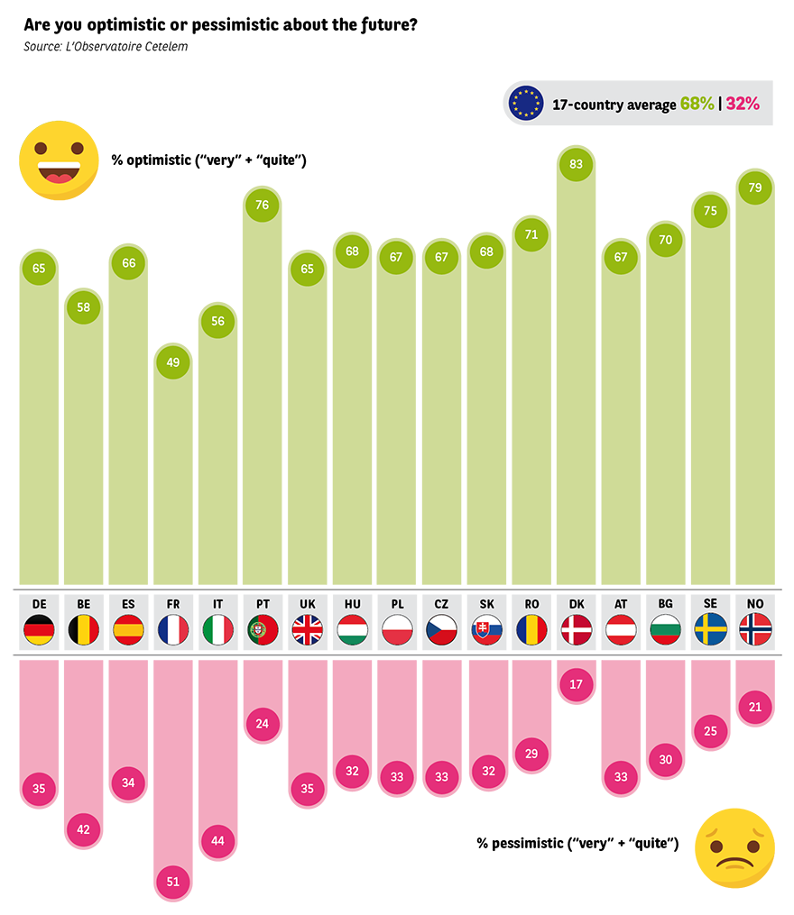 When questioned about their vision of the future, Europeans remain upbeat. 7 out of 10 declare that they are optimistic, or very optimistic, about the future. The clearly reinvigorated Danes, Norwegians and Portuguese believe that the future is bright (79%, 75% and 76%, respectively). Once again, the French stand out due to their ambivalence about the future. They are the only population to contain a pessimistic majority (51%), far ahead of the Italians and Belgians (44% and 42%).