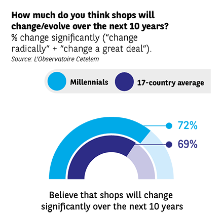 Looking 10 years ahead, 72% believe that shops will have evolved significantly. This is an opinion shared across the board, with few differences between the countries. This generation was born during an era of change punctuated by technological breakthroughs, with obsolescence always on the horizon and constant evolution as a philosophy. Retailers could never have escaped this process of profound change.