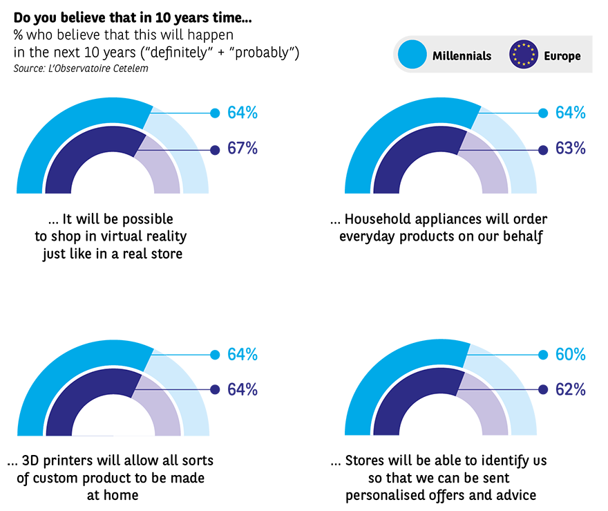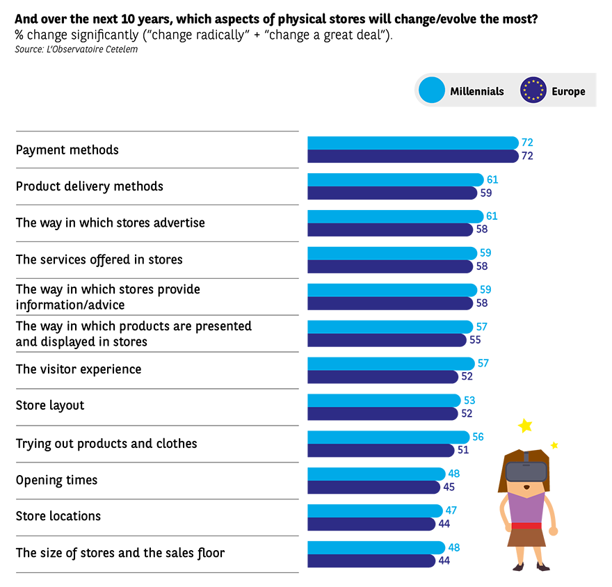 And, according to Millennials, almost everything will be affected. From payment (72%), delivery (61%) and advertising (61%), to services (59%), advice (59%), product presentation (57%) and the shopping experience (57%), every aspect of physical retail is set to undergo a Copernican revolution that will take it to a new dimension and alter its very nature. Of all the European Millennials surveyed, the Swedes and Romanians are the most inclined to imagine that shops will be fundamentally transformed in 10 years time. The Czechs and Belgians expect these changes to be less pronounced. Meanwhile, the French are somewhere in the middle.