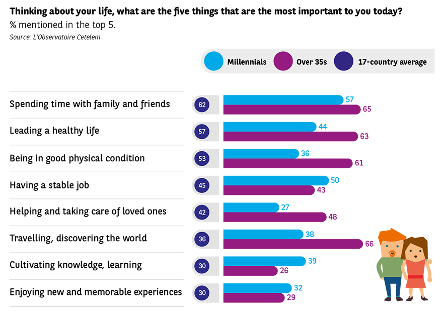 Spending time with family and friends is what Millennials believe is most important. Indeed, 57% are of this opinion (vs. 65% of over 35s). The Czechs, Slovaks and Romanians are the most likely to feel this way (66%, 66% and 62%), while only 46% of Italian Millennials declare that it is important to them. This is a result that puts certain preconceptions to bed.