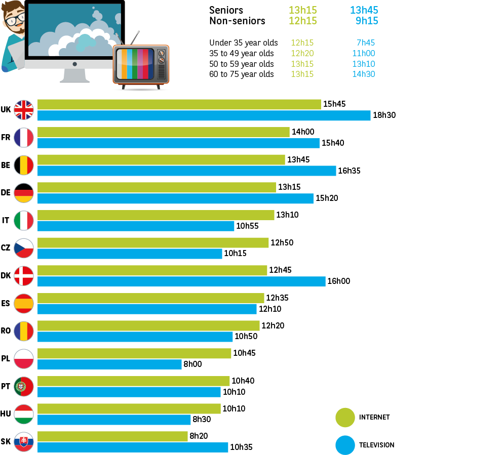 At first glance, seniors have more free time than 35 to 49 year olds. They devote more time to the internet than to regular activities out of the home. In this respect, they are very similar to the younger generations.