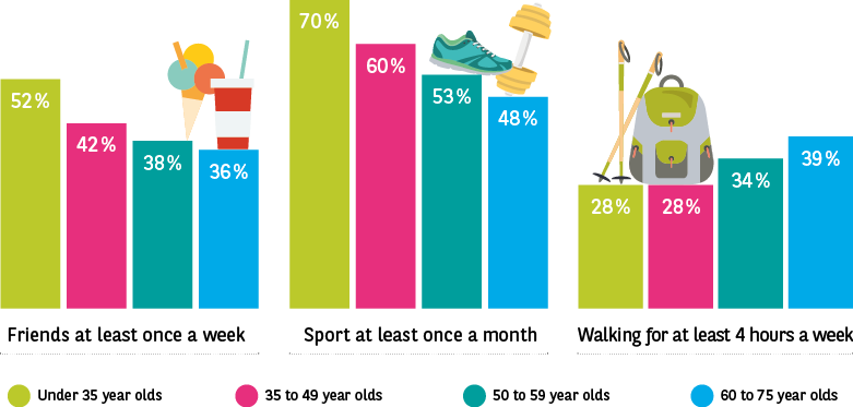 Fig. 23 How often do you partake in the following activities? Seeing friends at least once a week / Practising a sport at least once a month / Walking for at least four hours a week)