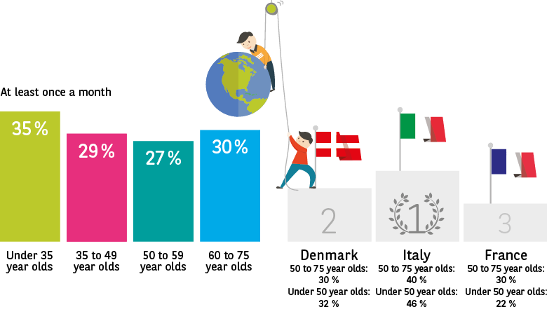 Getting involved, sharing one’s experience, being of use, taking on responsibilities and meeting new people are just some of the pluses. But are seniors as keen to work for non-profit organisations in all European countries? Relatively speaking yes, because some 30 % of seniors give their time to an association at least once a month. However, this is a similar proportion to under 50s (Fig. 24).