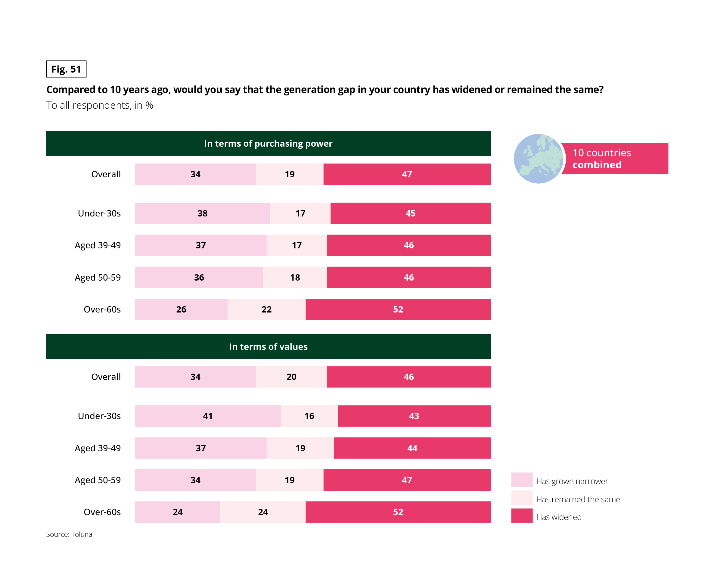 Echoing the reality of the figures, which reveal the differences in income between age groups, more than half of senior citizens believe that the gap between generations has widened over the last 10 years in terms of purchasing power.