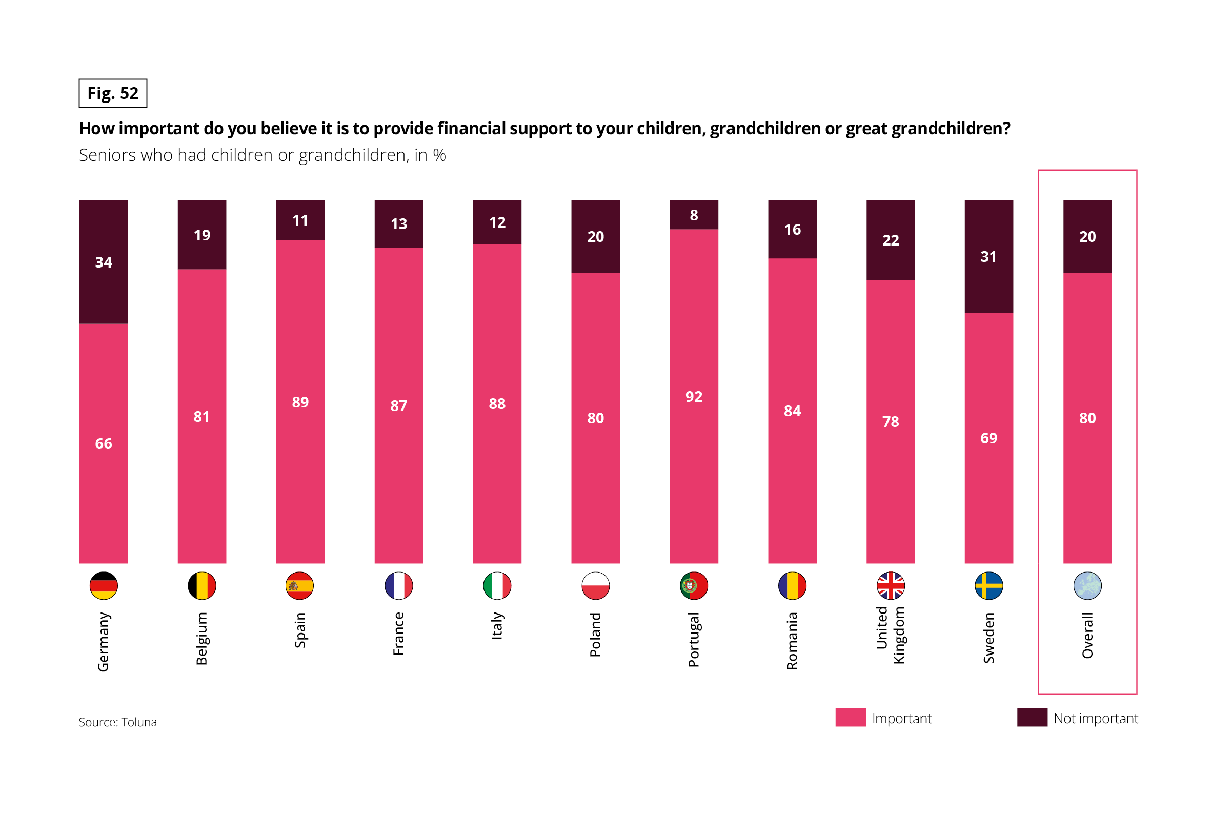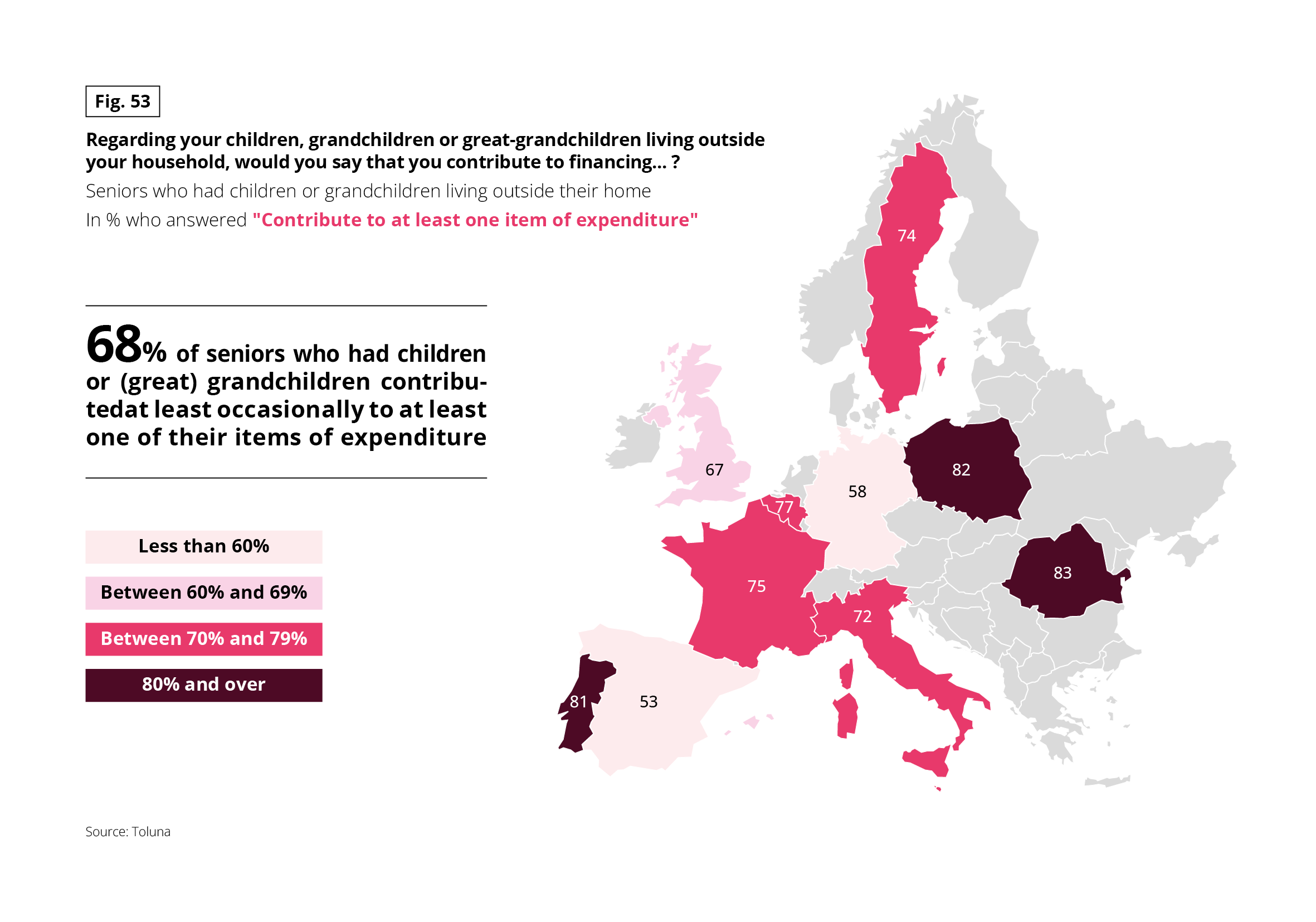 8 out of 10 consider it important to help their offspring. This is particularly the case in Latin countries, where intentions are close to, or even exceed, 90%. This is in contrast to Germany and Sweden, where this intention is less self-evident. Another illustration of the socio-cultural and even cultural differences between Catholic and Protestant countries? The desire to help one’s children financially does not stop at intentions, but becomes a reality for the vast majority of seniors. 7 out of 10 occasionally reached for their wallet to help with at least one item of expenditure. In this respect, geographical and cultural maps have been completely reshuffled. Alongside the Romanians, Poles and Portuguese, the French and Italians were the most generous. The Germans and the Spaniards formed a pair of more frugal countries.
