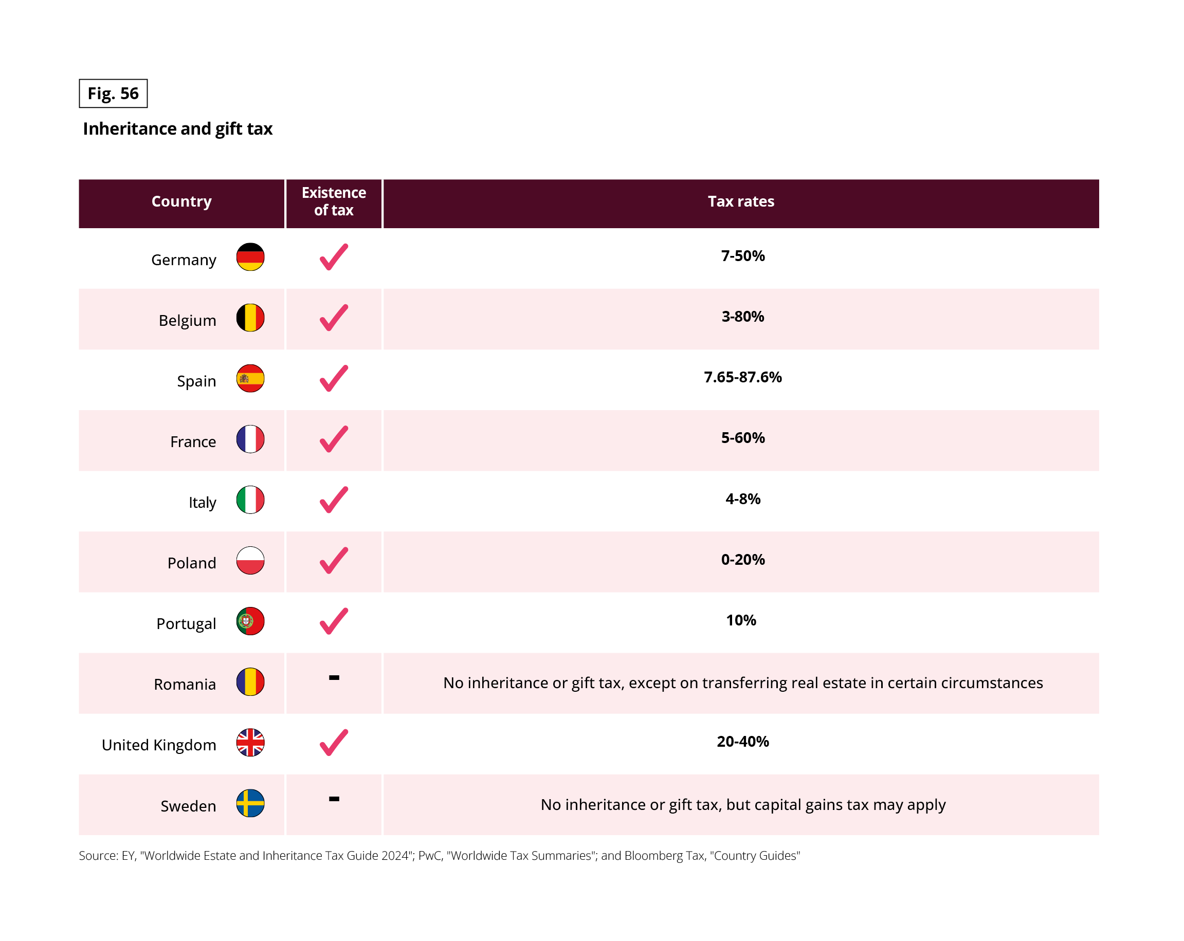 This table compares the existence of an inheritance and gift tax and the applicable tax rates in several European countries.