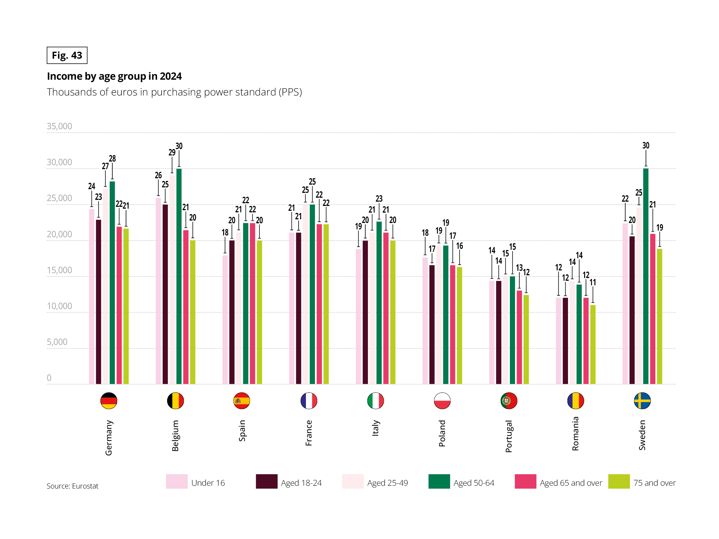 This graph presents income by age group in 2024, expressed in thousands of euros in PPP, for several European countries.