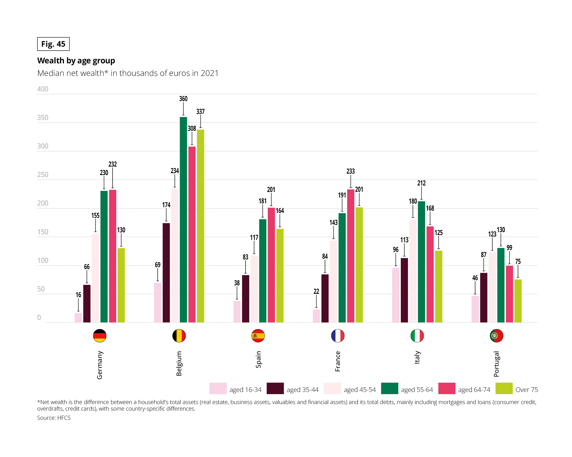 When it comes to wealth and assets, the situation varies from country to country, with Belgium being an “El Dorado” for senior citizens. With age, wealth gradually rises, often thanks to the acquisition of a home. This explains the marked difference between the under-35s and 55-64 year olds.