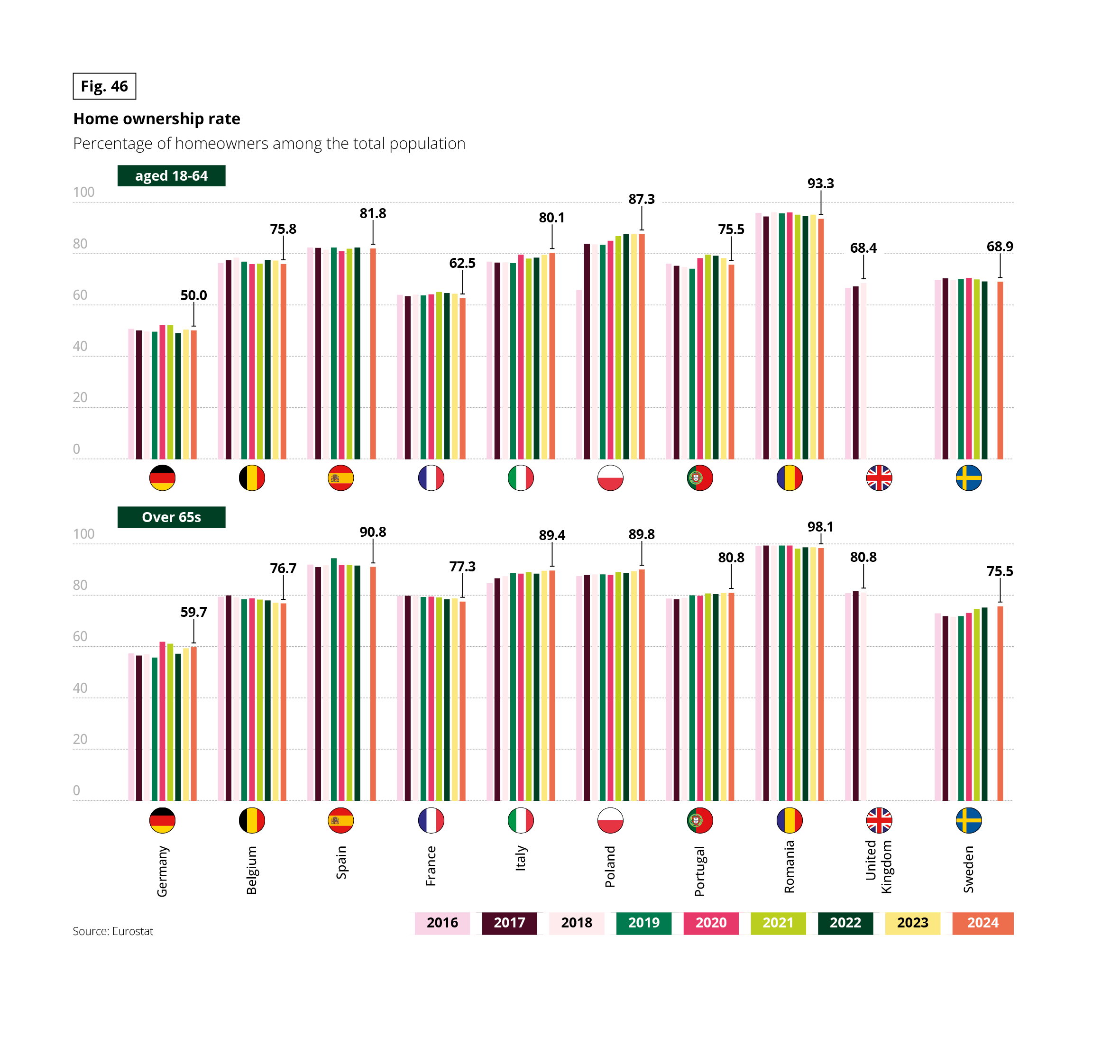 The data are presented for several European countries from 2016 to 2024. Among 18-64-year-olds, the rates vary by country, with high levels in Romania and Spain, exceeding 80%. Among those 65 and over, the rates are generally higher than for working-age individuals, reaching over 90% in some countries like Romania.