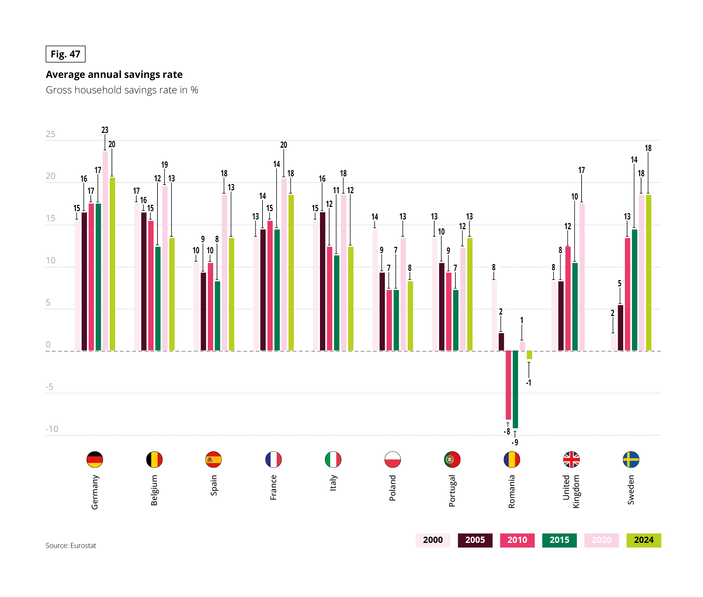 This graph presents the annual gross household savings rate, expressed as a percentage, for several European countries between 2000 and 2024.