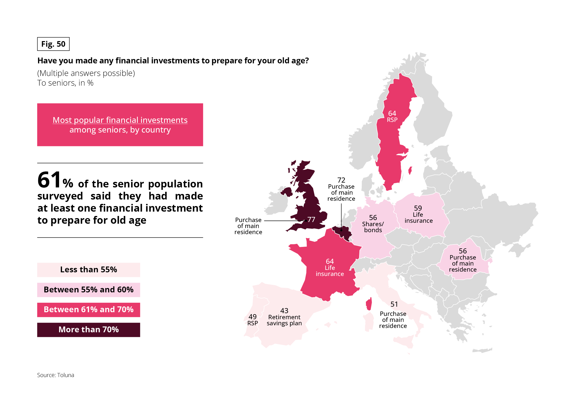While housing is often the largest component of seniors’ assets, it is not the only financial lever they use to prepare for the future. 6 out of 10 senior citizens said they had made at least one investment for their retirement, with choices varying from country to country. 30% had become homeowners, with the British and Belgians the most likely to invest in property. 21% had succumbed to the charms of life insurance, particularly Polish and French life insurance. 20% had taken out a retirement savings plan, especially the neighbouring countries on the Iberian Peninsula. 18% had bought shares or bonds, following the Germans’ example.