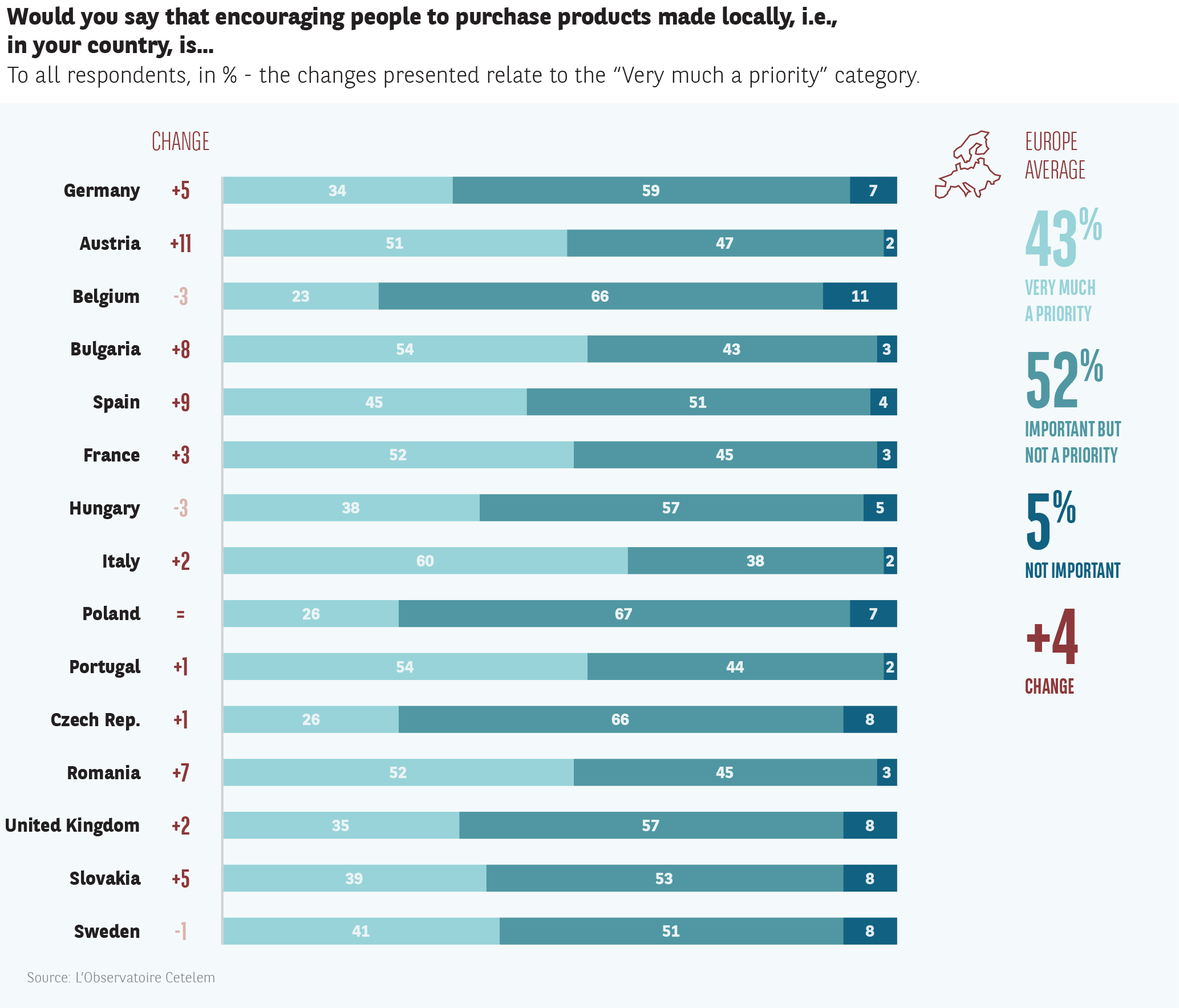 The shift observed in another score since last year demonstrates that localism is taking root in the minds of consumers (Fig. 32). the proportion of Europeans who consider it a priority to encourage its development is up 4 points (43%). There are six countries in which more than 1 in 2 respondents take this point of view.
