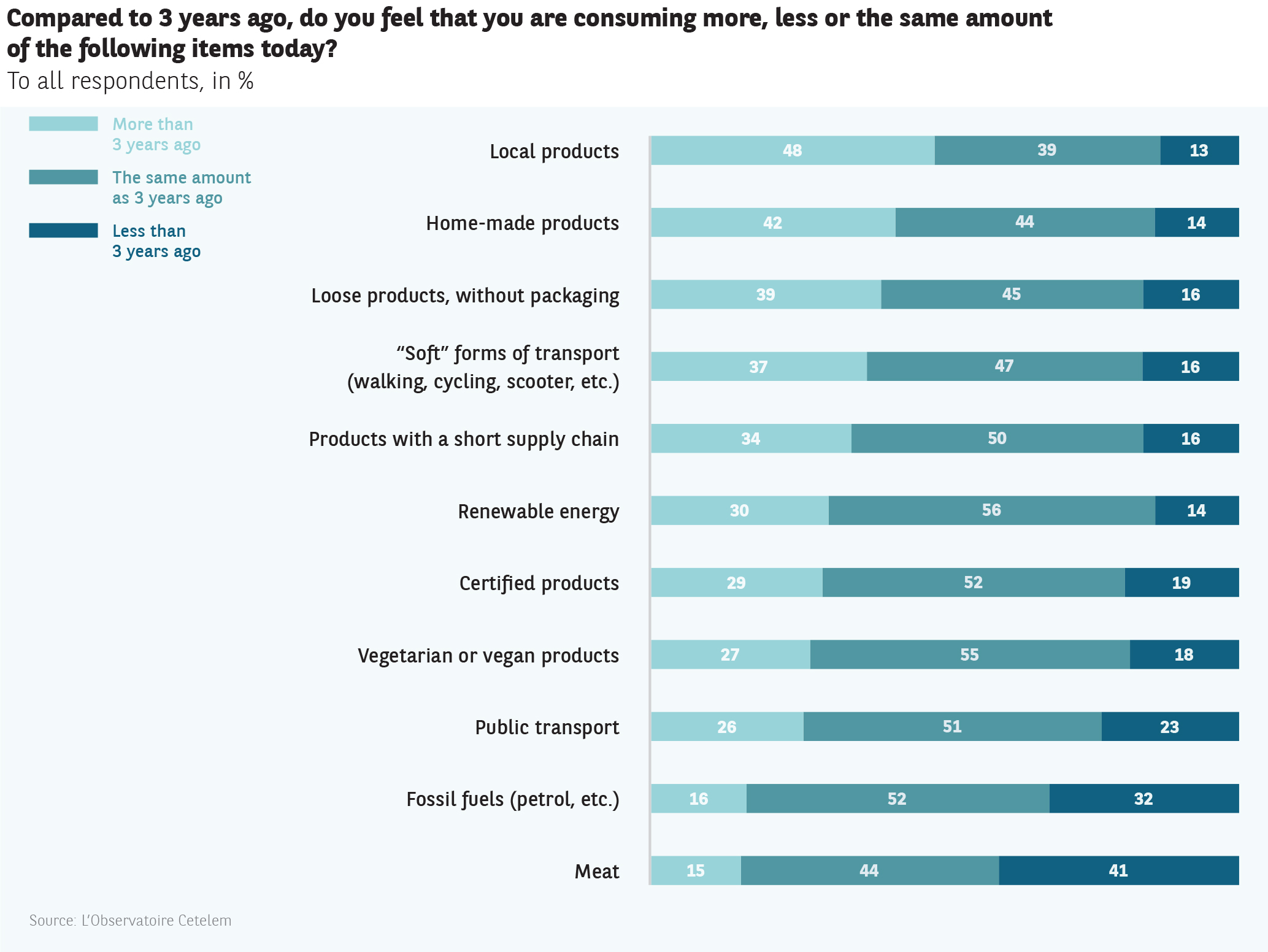 Other results point to a fundamental change in consumer behaviour. the sale of loose goods appears popular (39%). the appeal of soft modes of transport is also confirmed (37%). Meat seems destined to become less and less common on the plates of consumers, with 41% of Europeans cutting down on their meat consumption in the last 3 years.