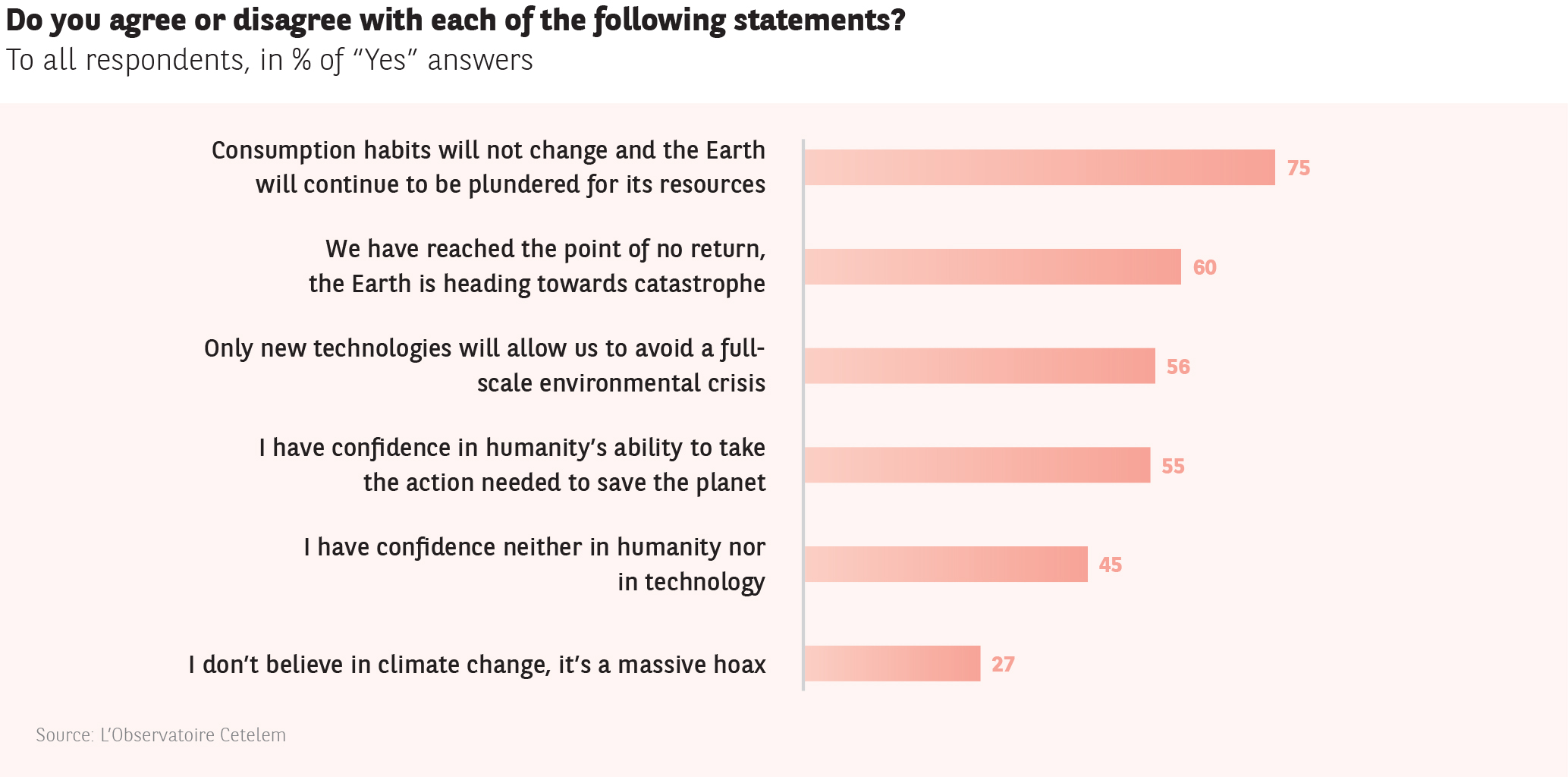 So are we all doomed? Not necessarily. Two glimmers of hope are visible in this fog of negative opinion. First there is technology, which 56% of Europeans believe can help counteract the environmental crisis. Second, despite all the pessimism, there is a belief that humanity will be able to take the measures required to save the planet (55%).